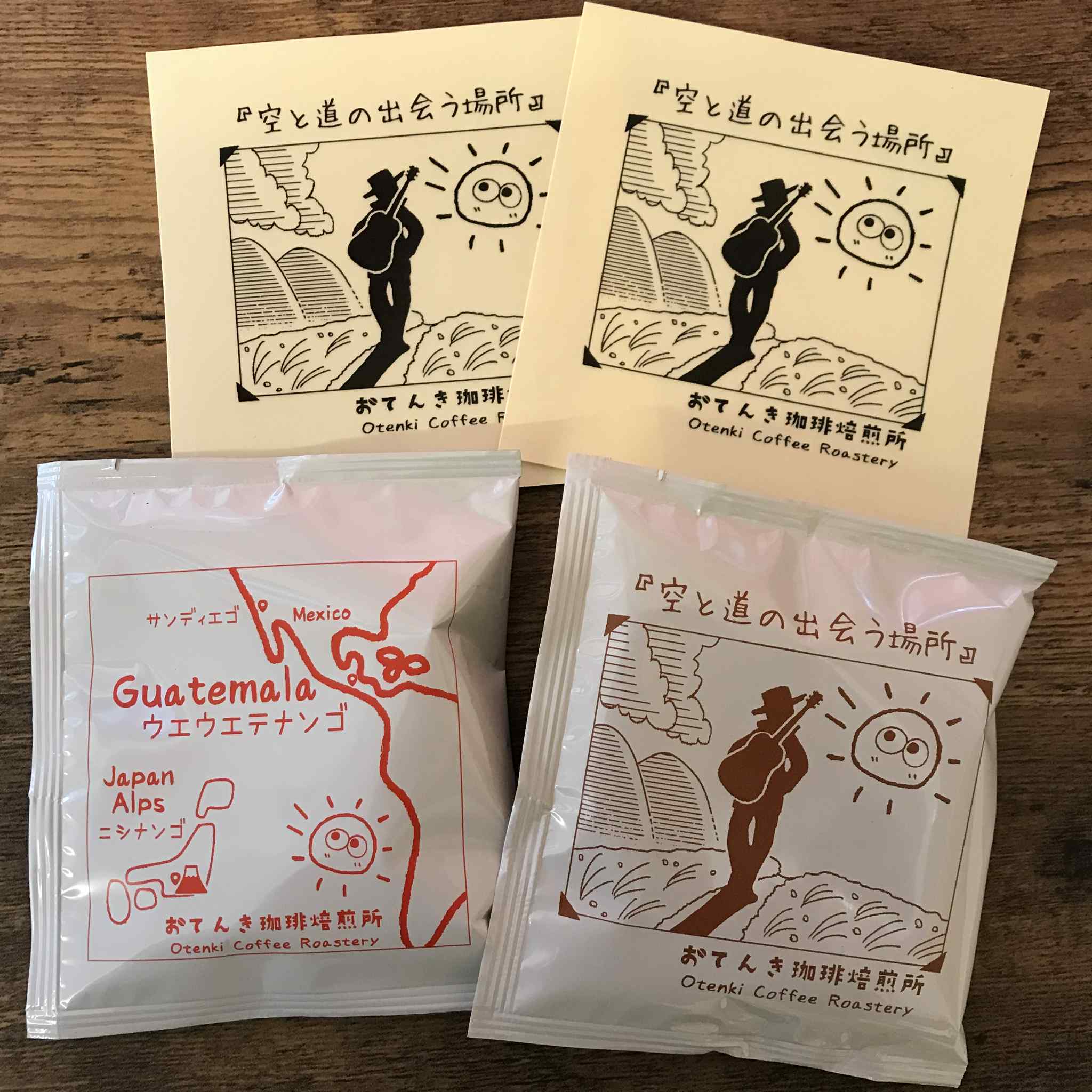 人気No.1のグアテマラと空と道のブレンドのドリップバッグコーヒーをそれぞれ1パックとステッカー2枚をセットにしてお送りします。